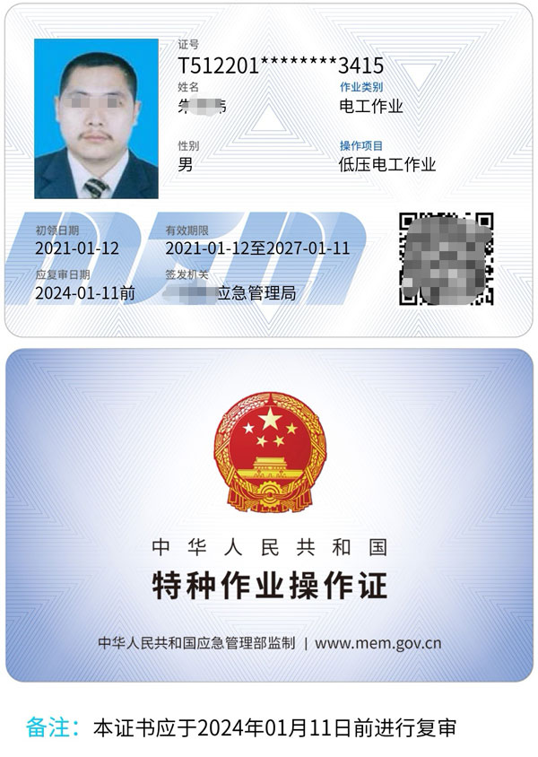 特種作業操作證、職業資格證書、建筑施工特種操作資格證。1.特種作業操作證:電工作業,電工作業操作證,分類: 高壓運行維護作業、高壓安裝修造作業、低壓電工作業、安裝、維修、發電、配電 ,發證機關;應急管理局(原安監局),復審,為3年一審,6年換一次證。低壓可從事電壓等級為0.4KV以下的電工作業,高壓可進網從事所有電壓等級的電工作業,持特種級別的進網作業許可證可從事高壓和低壓線路實驗等特種作業,進網作業許可證每3年一審。電工進網許可證分為三大類,分別是低壓類、高壓類和特種類,特種類又分為繼電保護工、電纜和高壓試驗三個專業。電工進網證是國家能源局頒發,作為審驗電工和電力從業人員持證上崗的重要依據之一。